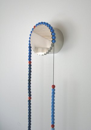 The Sasa Clock (Housatonic, Mass.) designed by Thorunn Arnadottir for HeadsUp Design Company Inc., for "its interpretation on the concept of time in an artistic and poetic manner." Made of a polished stainless steel hub and beech wood beads, time can be read from a color coded necklace—with each bead representing a 5 minute increment. The necklace is available in both 12 and 24 hour versions; natural wood with white, "hour" beads and blue stained wood, with orange "hour" beads. http://www.headsupco.com/